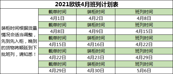 關于我司歐鐵荷郵小包渠道2021年4月份班列截開時間安排如下表(截單時間表示當天到的貨會處理),我司走的是圖定班列,每周班列發車時間有保證,時效穩定,到達荷郵提取時效是裝柜后26-28天。請廣大客戶知悉,謝謝!